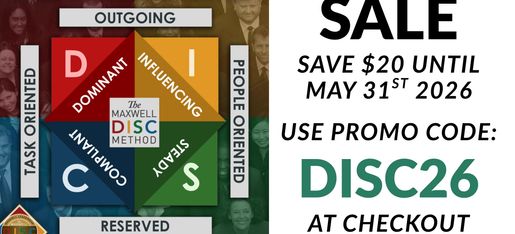 The Maxwell DISC Personality Assessment is unlike any other DISC assessment! It provides a 30+ page report with your PowerDISC highlighting your top strengths, communication style, motivators, growth opportunities, and more! this assessment is great for anyone who want to grow in their emotional intelligence, career, and communication. Normally $47, save $20 by purchasing your assessment before May 31st 2026 by using promo code: DISC26 at check out!